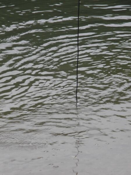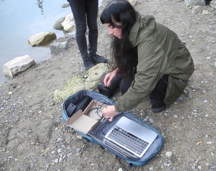 Ihre Recherchen und ein umfangreicher Spaziergang haben Nieves de la Fuente zu einem besonderen Ort geführt. Aufgeschütteter Kies hat einen rampenartigen Zugang zur Donau erzeugt. Genau gegenüber mündet die kleine Blau in den Strom; die nebenan gelegene Hindenburgbrücke hatte die Künstlerin bereits bei der vorbereitenden Lektüre beschäftigt. Diese Situation hat sie geradezu herausgefordert, hier ein Konzert anzusetzen. Zu all dem, was üblicherweise beim Betrachten des Wassers an Wahrnehmungen, Empfindungen und Projektionen geschieht, tritt hier eine durch ein eines Hydrophon aufgenommene akustische Komponente. An einer Angel befestigt, macht es Impulse unter der Wasseroberfläche hörbar.