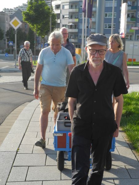 Das fällt den Mitgehenden keineswegs leicht. Immerhin waren die Streifzüge bislang immer recht kommunikative Ereignisse. Und der Weg führt an Orten entlang, die vielen nicht bemerkenswert erschienen: Reparaturwerkstätten und Fahrradverleihstationen.